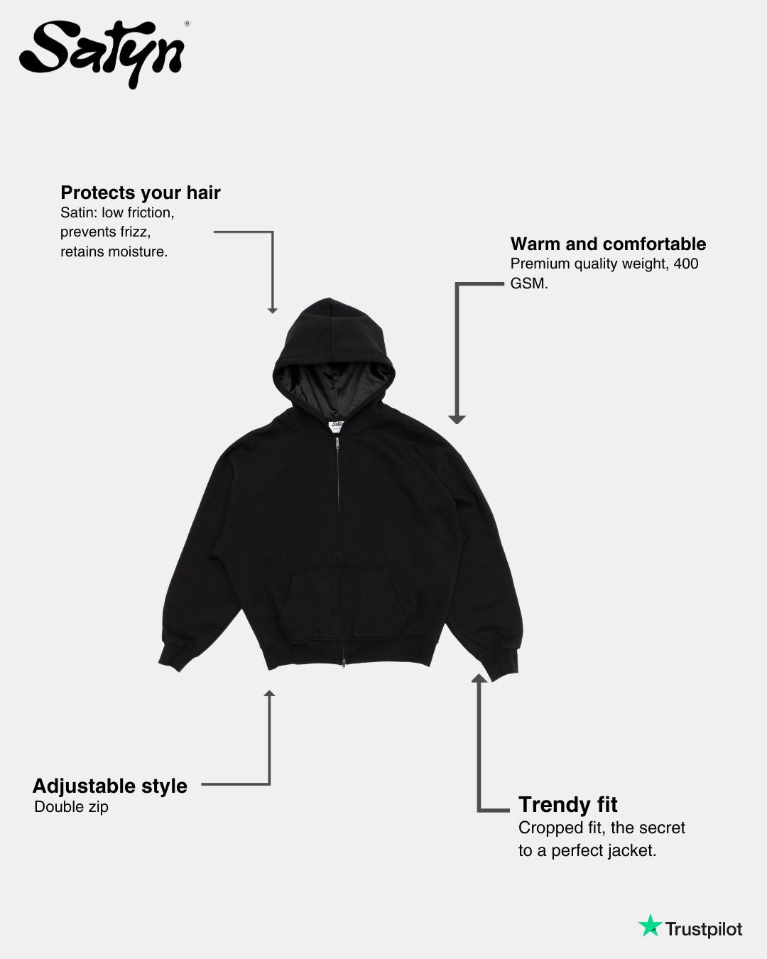 The Satinn zip-up hoodie is the perfect combination of comfort, style and hair care. Designed to provide ideal warmth during the winter while taking care of your hair, it features a satin-lined hood that preserves your hair's moisture and protects against frizz. With its oversized fit and premium finishes, this hoodie is a must-have for a modern look and optimal protection.